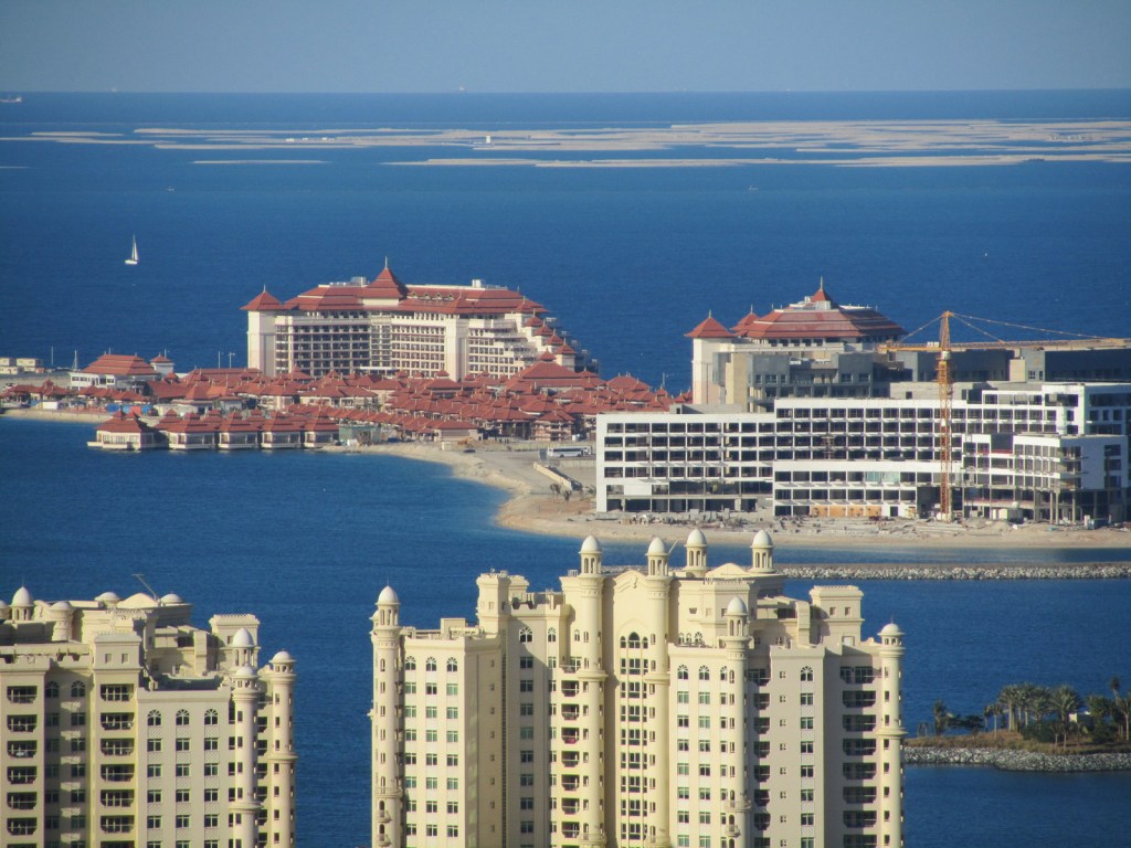 It’s difficult to photograph the Palm islands without the aid of an aeroplane, however in this shot the apartments on the trunk are visible in the foreground, hotels on the crescent in the middle, and the World islands in the distance. Palm Jumeirah, the smallest of the three planned palm islands, required earthworks of over 100 million tonnes to reclaim from the sea.
