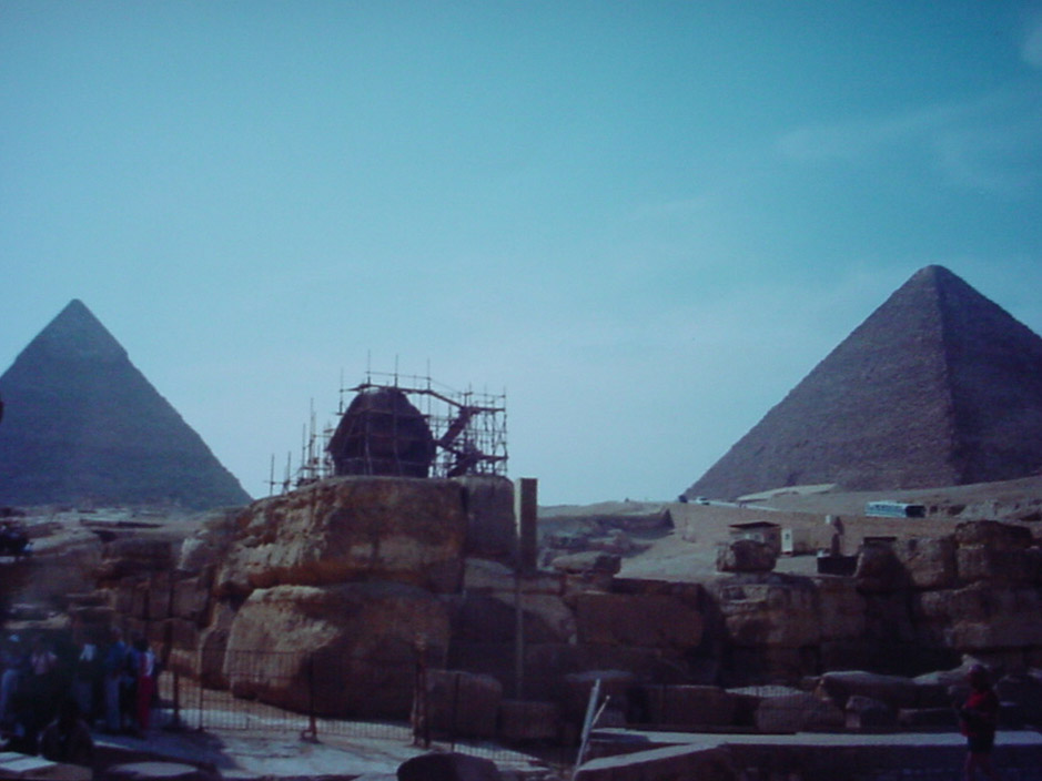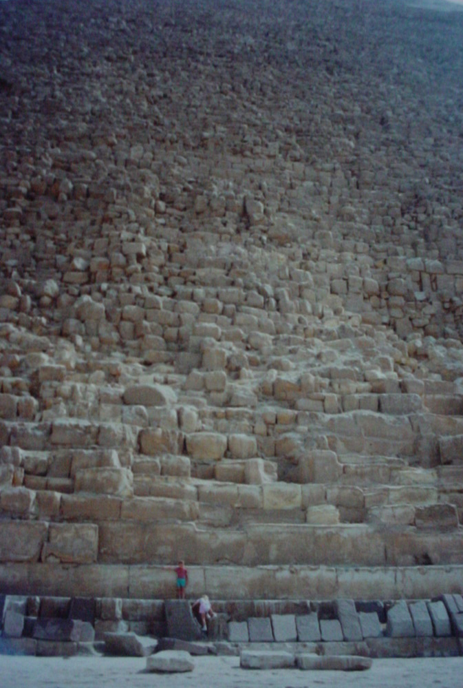Closer detail of the Pyramid of Khafre, as modelled by my sister and I for full appreciation of its enormous scale. I doubt you’d get away with hopping up on it these days. The pyramid is 136 metres tall with a base of 215 metres and weighs nearly six million tonnes, making it significantly larger and orders of magnitude heavier than its modern cousin in Las Vegas. It was a good time for visiting pyramids, as we found ourselves in Mexico later the same year.