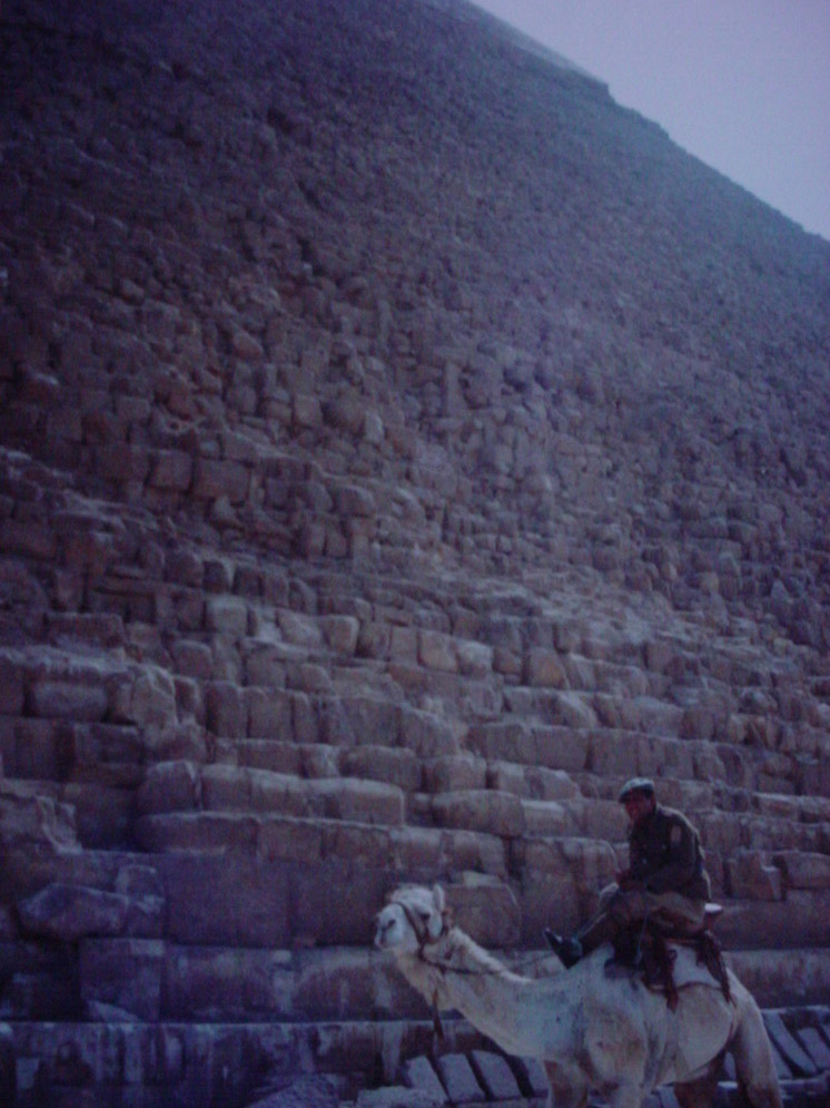 The Pyramid of Khufu, in the centre of the Giza Necropolis, with a camel-mounted policeman on patrol. This pyramid is distinguished by the remaining smooth(ish) facing stone remaining on its upper third, just visible here. All the pyramids were built around 2500 BC, and are the only remaining Wonder of the Ancient World. Originally they would have shone in the desert sun, with the smooth facing stone reaching down to the dunes, and the crowning pyramidion rumoured to be plated in gold.