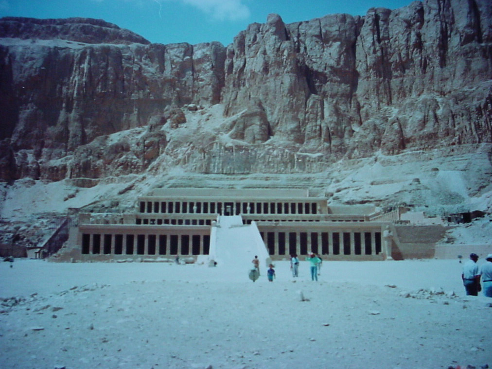 The Mortuary Temple of Hatsepsut at Deir-el Bahari, backing right on to the Valley of the Kings on the other side of the cliffs. Hatsepsut was the first female pharaoh, ruling until 1458 BC, however the temple was desecrated soon after by her successor. Over the years other occupiers caused damage including Christian images painted over original carvings from 2000 years earlier.