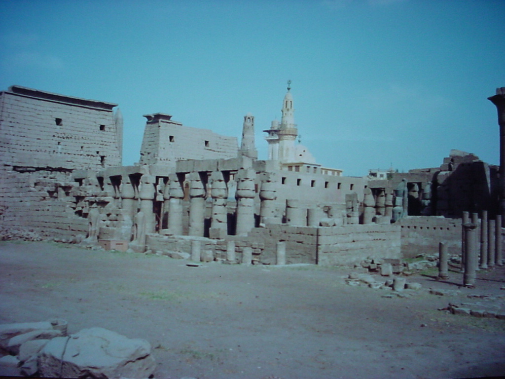 The Luxor Temple, with the Court of Ramses in the foreground, looking towards the entrance known as the First Pylon (the two large blocks), with a single obelisk visible in between. Its obelisk partner was pinched by the French in the 1830s, and now sits in Paris. Temple construction began around 1400 BC, and beyond is the Avenue of Sphinxes.