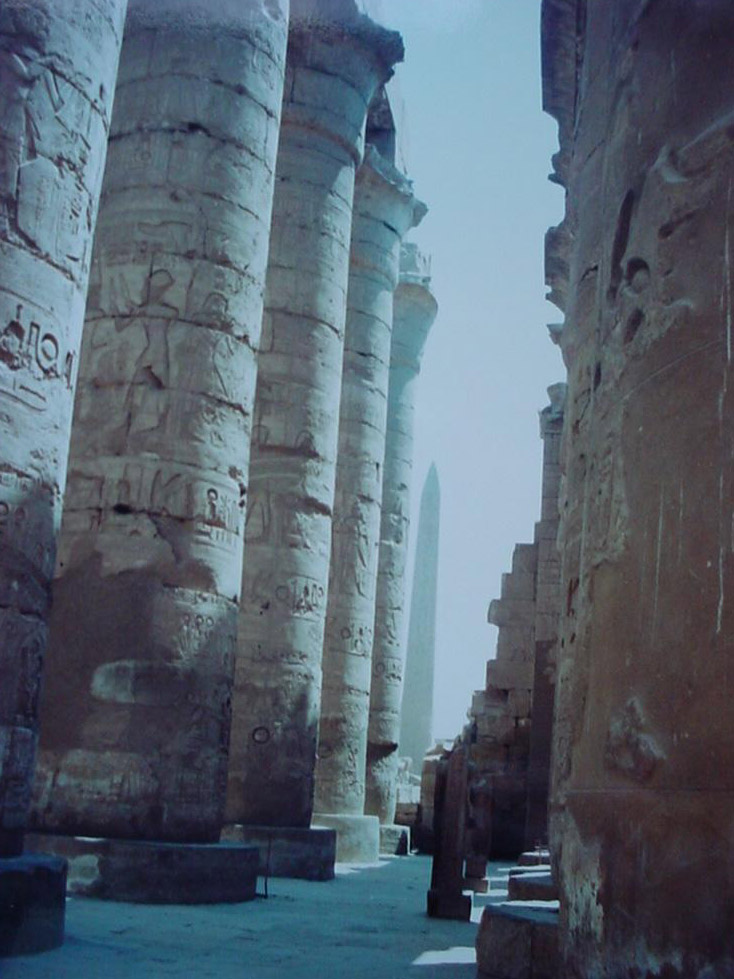At the opposite end of the Avenue of Sphinxes is Karnak, the most visited attraction in Egypt after the pyramids. It was founded around 1970 BC, with the Great Hypostle Hall at its centre dating from around 1224 BC, an assembly of 134 columns. In the distance the Obelisk of Thutmose I can be seen.