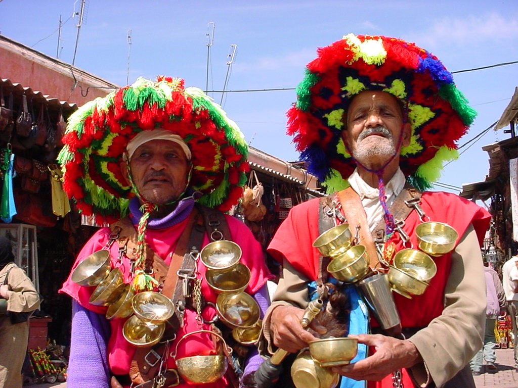There were a few of these lads going around the medina and the Djema el-Fna, indicating that they wanted you to take their picture then cross their palms with silver. We eventually succumbed and got four photos out of them for a Euro. They are traditional guerrabs or water porters, and will serve water in their brass cups from the goatskin bags under their arms.