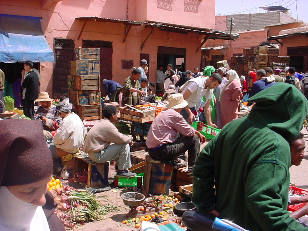 We emerged into the sunlight at a local market, with food being sold straight off the ground. Note the woman on the left covering her face, and the man on the right in the traditional Berber hooded green cloak. This picture captures much of the essence of Morocco, I think.