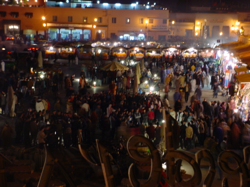 The Djema el-Fna or Jemaa el-Fnaa is the central square of Marrakech and where all the action happens. The café Argana in the background was the site of a deadly terrorist bombing several years later in 2011, targeting tourists in Morocco.