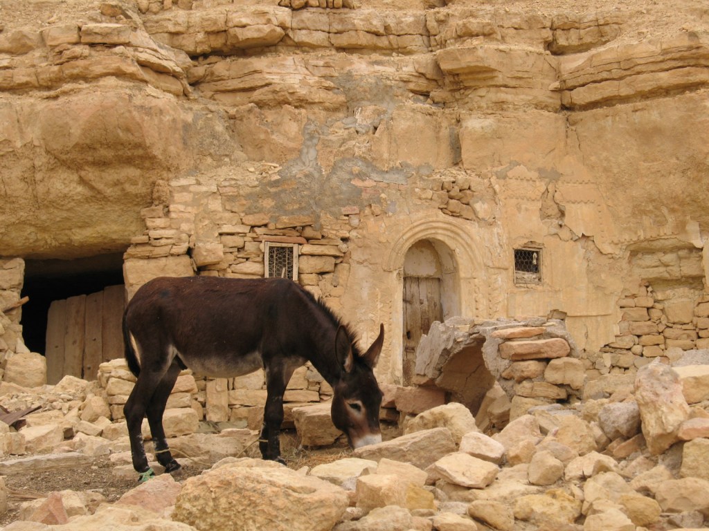 A local donkey busies itself outside one of the few remaining intact properties in Douiret.