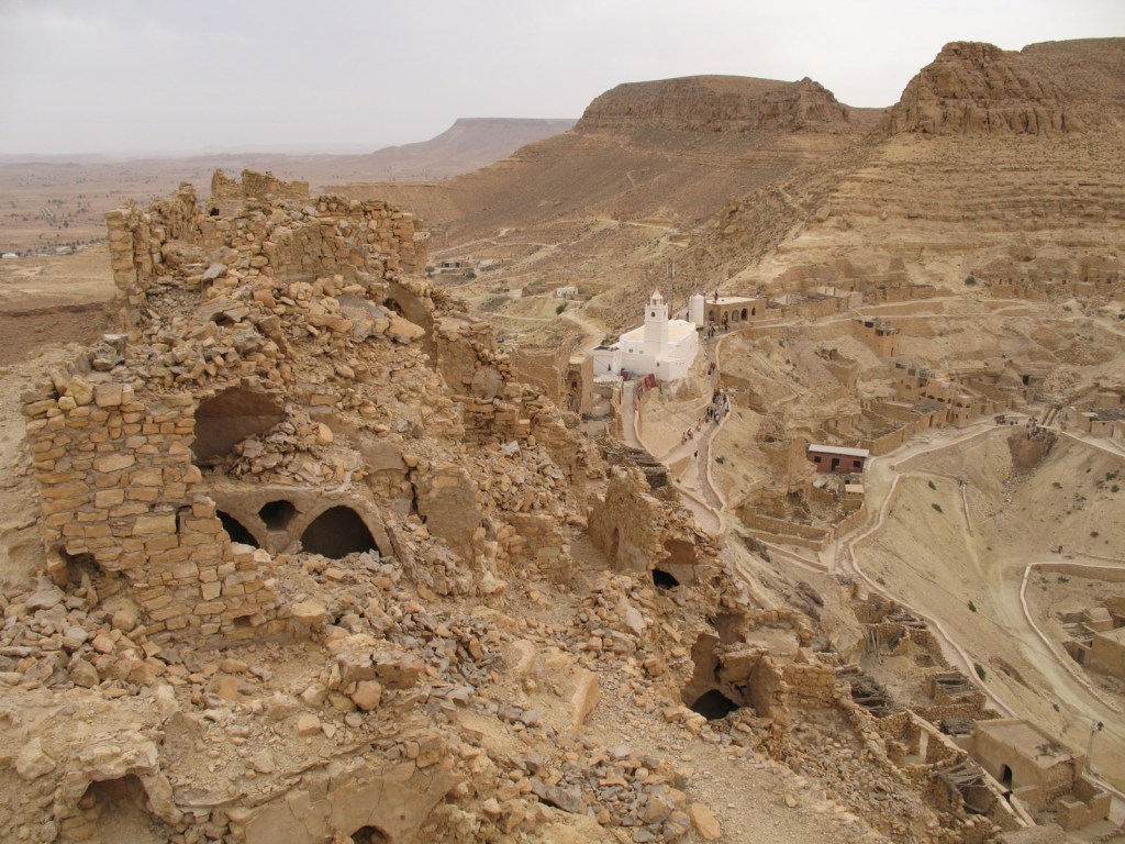 Looking down from the summit ridge of Chenini, across collapsed rooftops to the modern village below. The hilltop ruins date back to the 12th century.