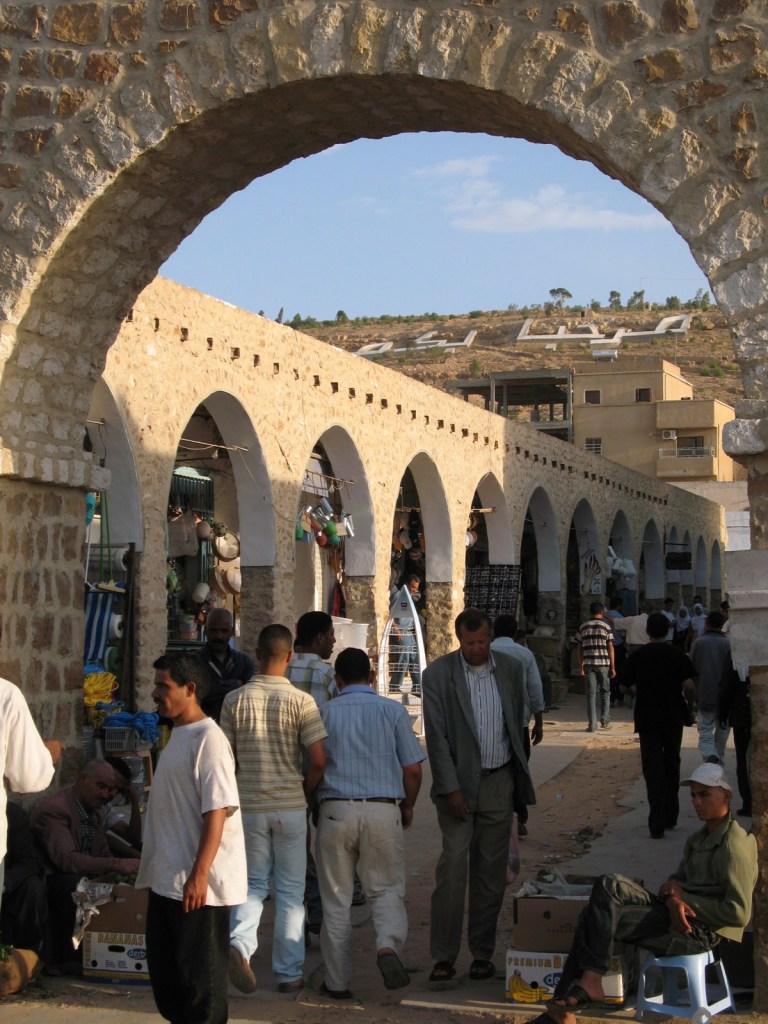 Back in Tataouine town itself, and all the blokes were out at the marketplace. On the mountainside behind, strangely reminiscent of the Hollywood sign, is a giant “Marhaba” welcoming all.