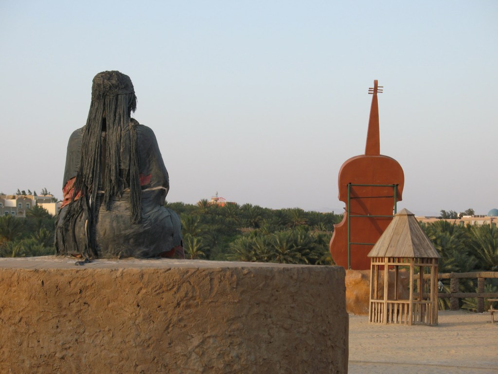 Tozeur’s Ras Al Ain music park was another strange place, although it kept to its theme with giant model violins and a large brooding matriarch (?)