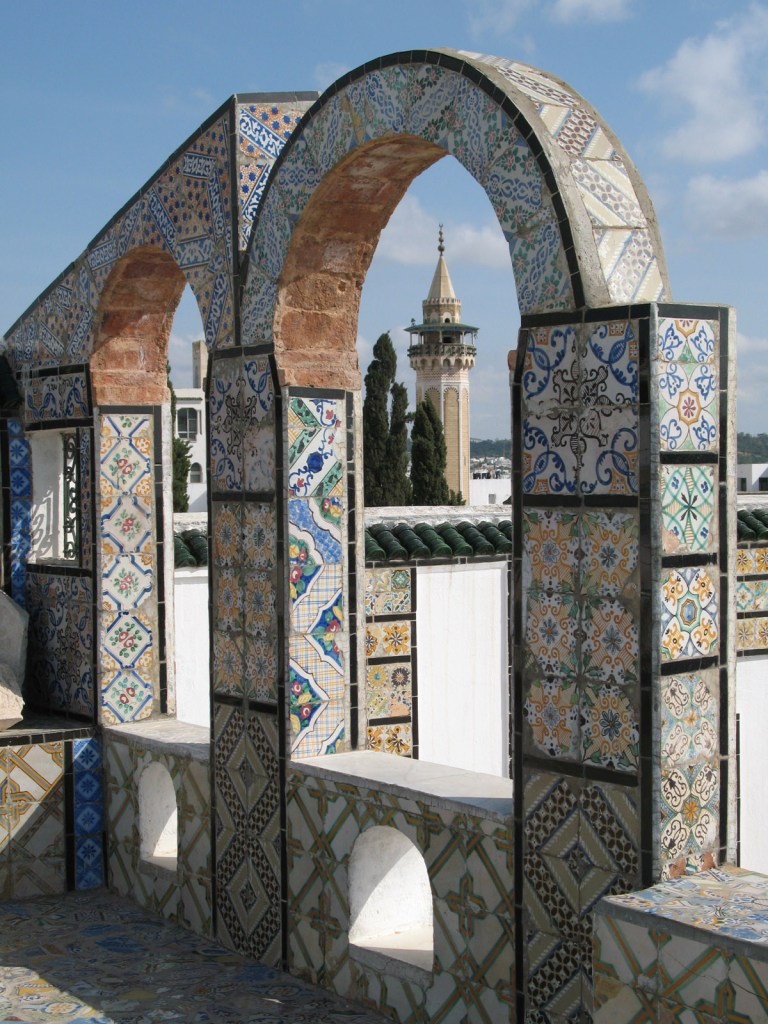 Traditionally tiled archways on top of a carpet shop near Al Zaytouna Mosque.