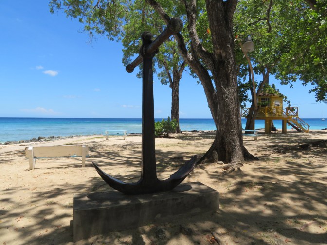 A monumental anchor stands at Folkstone Marine Park, immediately north of Holetown Beach.