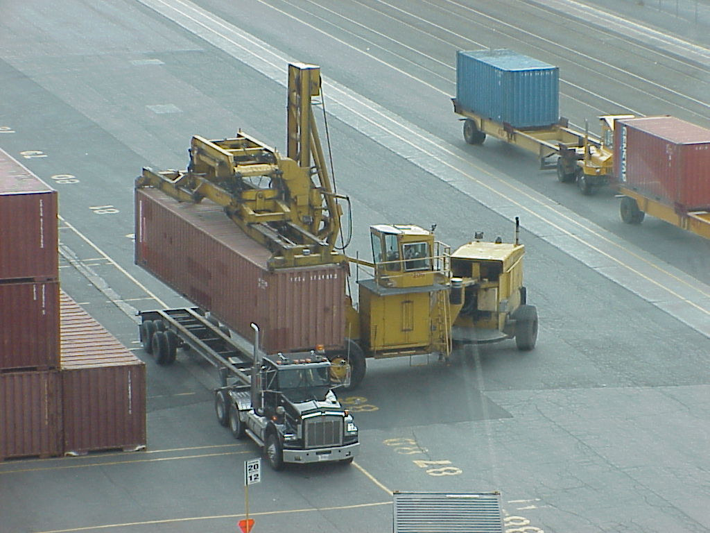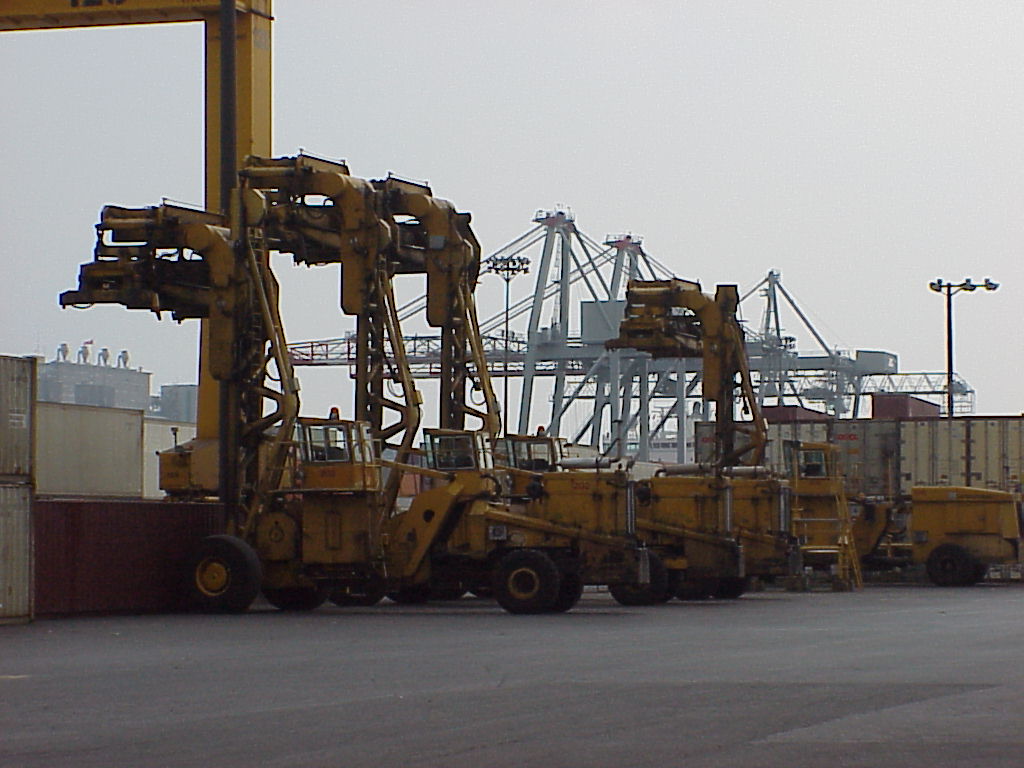 The loaders are capable of grabbing forty-foot containers at each end off the back of an articulated lorry. Watching them at work was like watching steel dinosaurs go about their business.