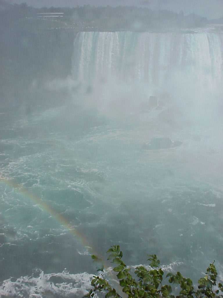 Looking downstream to the American Falls, and the Rainbow International Bridge which straddles the border. Appropriately, there is a rainbow in shot too.