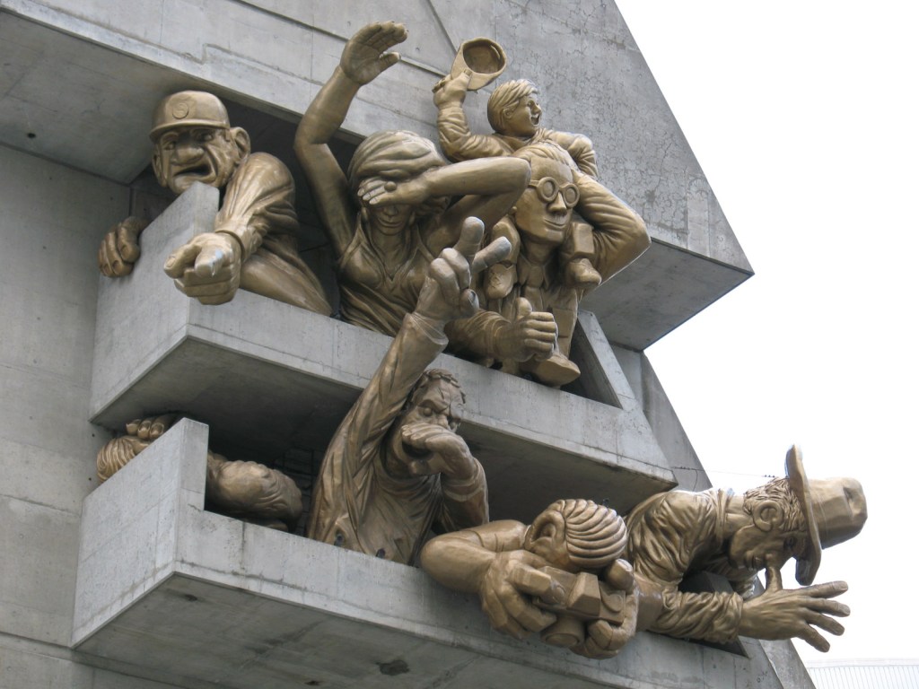Effigies of typical Canadian sports fans adorn the sides of the Rogers Centre – one of several artworks commissioned, this one is The Audience by Michael Snow.
