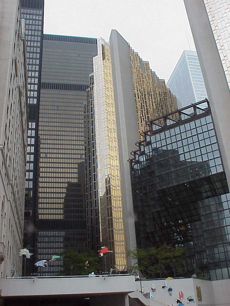 Examples of Toronto’s 1970s downtown office architecture, including the Royal Bank Plaza, which is tinted with 71 kilos of gold dust embedded in the glass cladding. The black towers of Toronto-Dominion Centre were completed in the International Style from the sixties to the nineties.