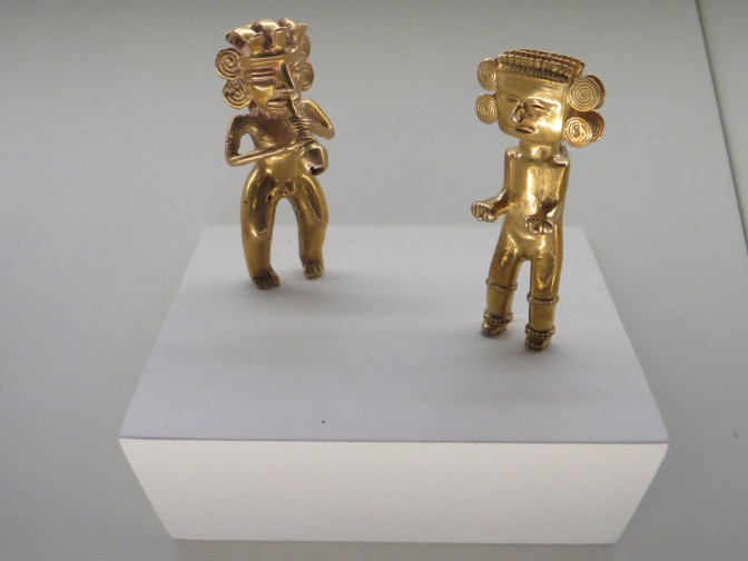 Underneath Plaza de la Cultura lies the vast Museum of Pre-Columbian Gold , featuring amongst other artefacts a treasure trove of over a thousand golden delights, such as this musician and dancer. These items escaped the plunder of the Spanish and are preserved for the nation.