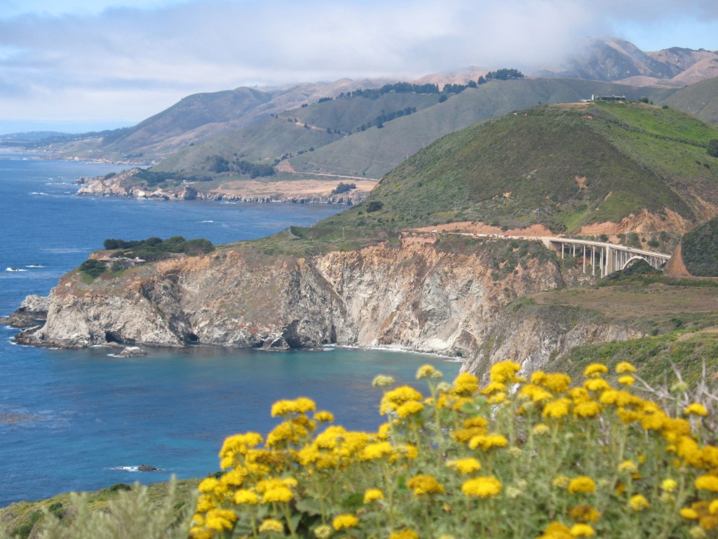 Yellow flowers, blue sea and some lingering fog clinging to the mountains, looking north up Route 1.