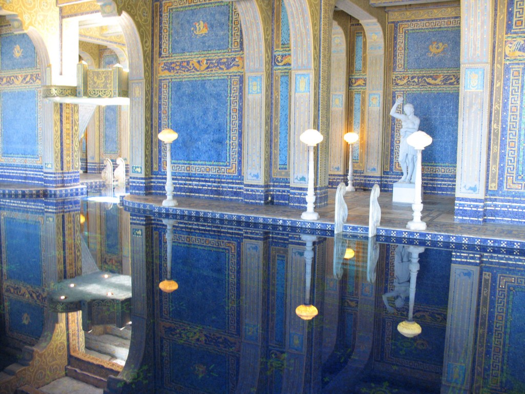 The Roman Pool, indoors behind the Casa Grande, is lined with blue and gold leaf mosaic tiles. It also features a waterfall, but that wasn’t running when we visited.
