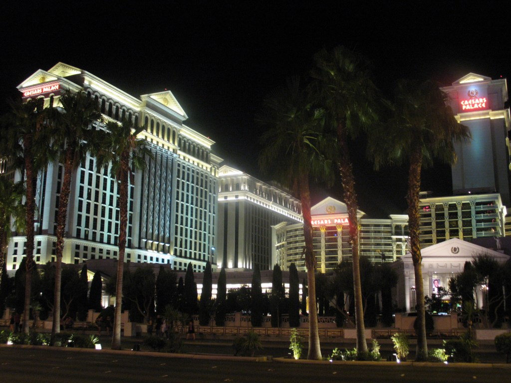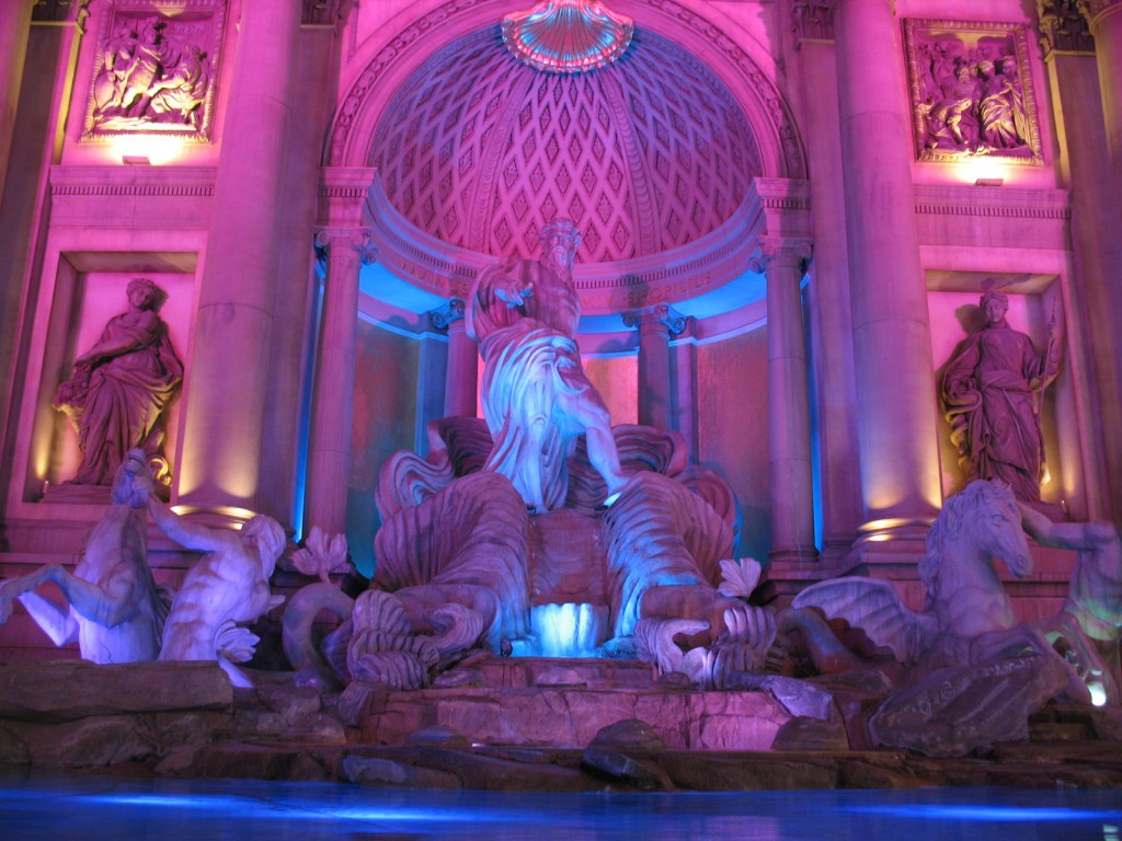 Outside Caesars Palace you can check out some of the splendours of Rome today, such as the Trevi Fountain. The real one isn’t quite as colourfully lit, but is perhaps a little more tasteful.