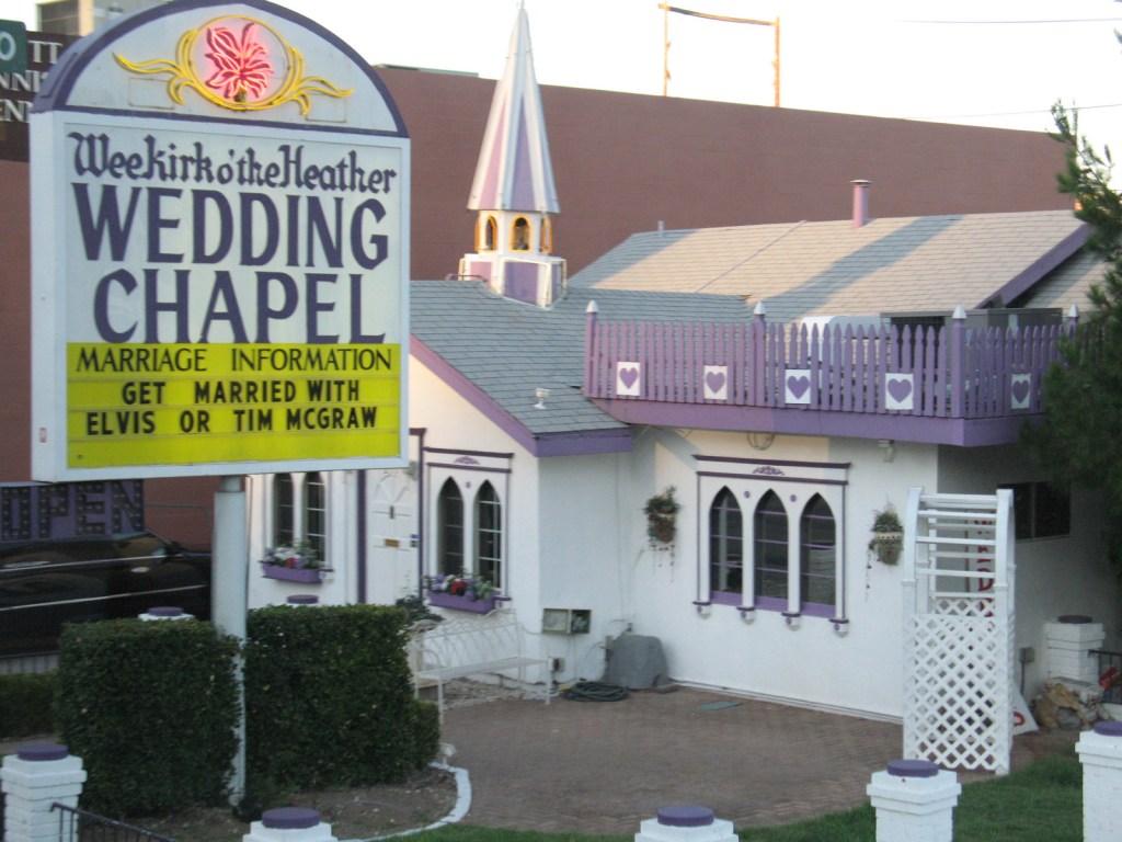 Another of Vegas’s draws, the wedding chapel. This particular Scottish kirk offers weddings by either Elvis or Tim McGraw, but remember that if you’re married in Vegas, you’re definitely married everywhere else too!