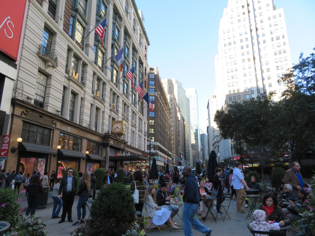 A view up Broadway outside Macy’s at 34th Street, as it scythes its angular route through the gridiron streets of Manhattan. Several sections such as this are now pedestrianised with pavement cafes.