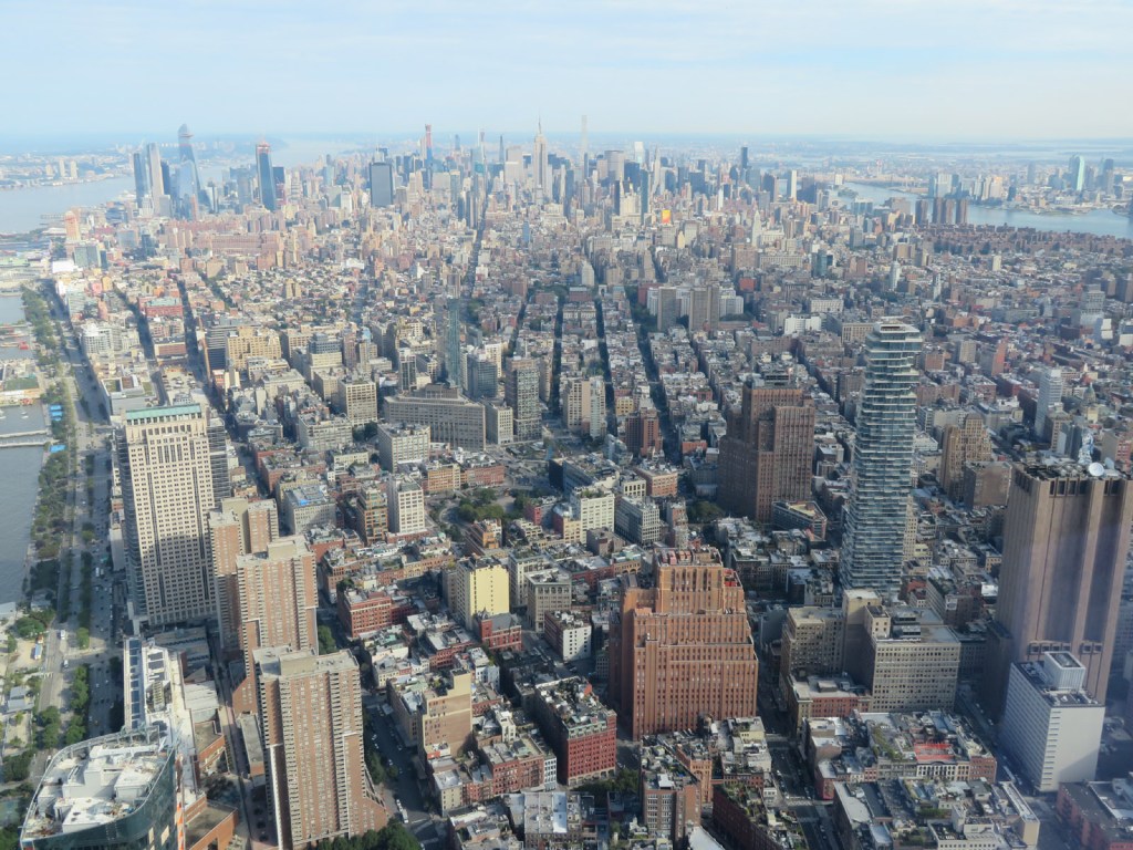 View from the top of one WTC looking back up Manhattan, with the overall shape of the island clearly visible. The Empire State Building can be picked out amongst the new toothpick towers around 59th Street, and the new Hudson Yards development in glass is on the left. The header photo of this page is zoomed in from the same vantage point.