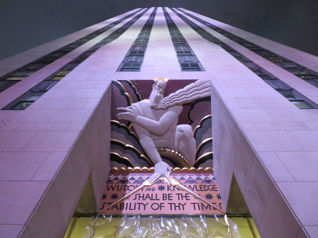 Detail of the carving “Wisdom” above the east entrance of 30 Rockefeller Plaza, the centrepiece of the development. The building itself was the location of the famous “lunch atop a skyscraper” photo during its construction.