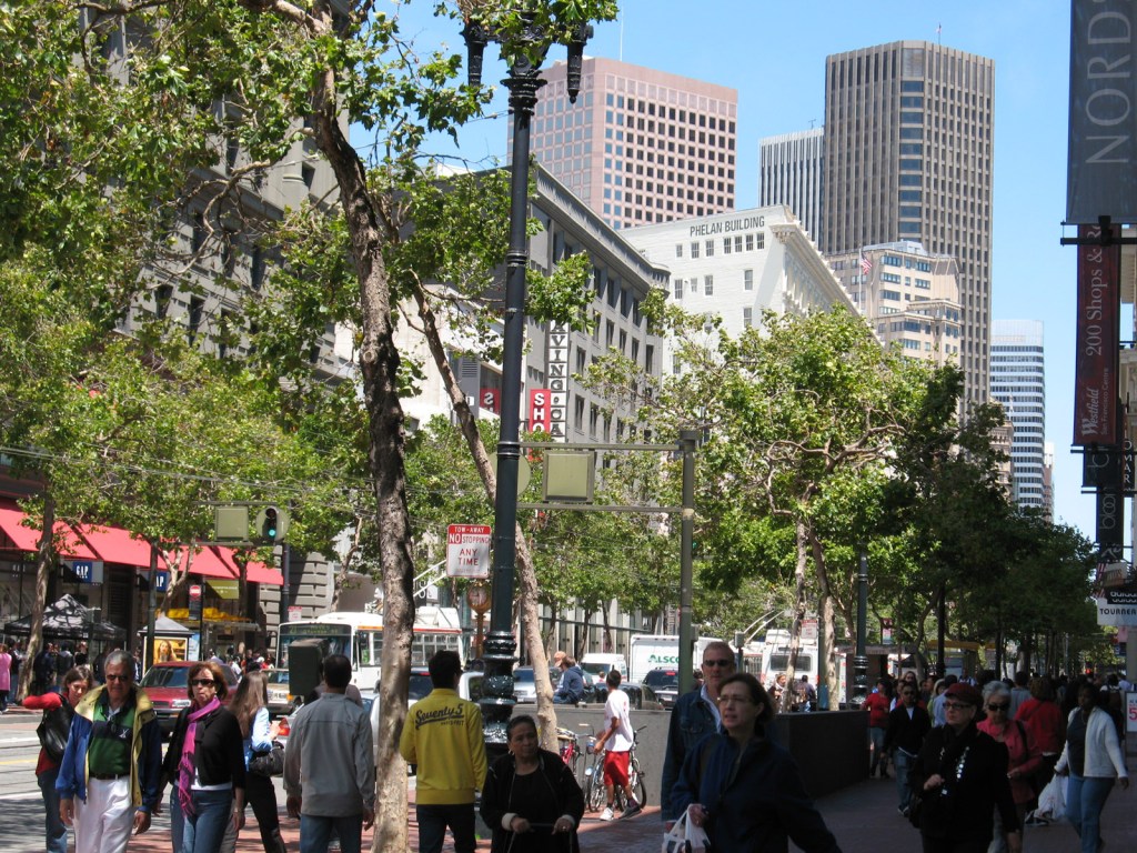 Market Street is the main shopping thoroughfare, heading from Union Square straight towards the Embarcadero and the Bay.