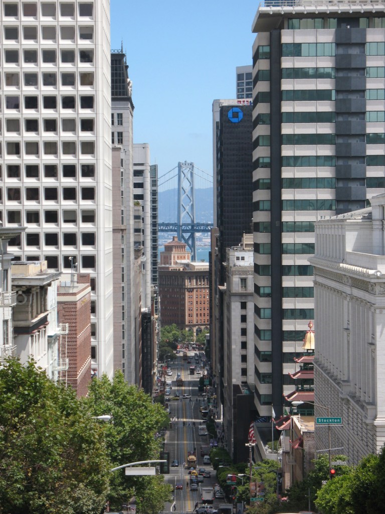 Looking down California Street, one of the city’s busiest and steepest. The famous cable cars run this route amongst two others, and climb with ease up the gradient. In the background the Bay Bridge is visible.