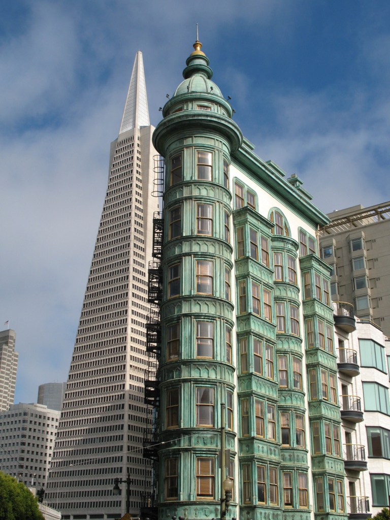 The green Columbus Tower, also known as The Sentinel Building stands in front of the Transamerica Pyramid. Columbus Tower is still the office of Francis Ford Coppola.