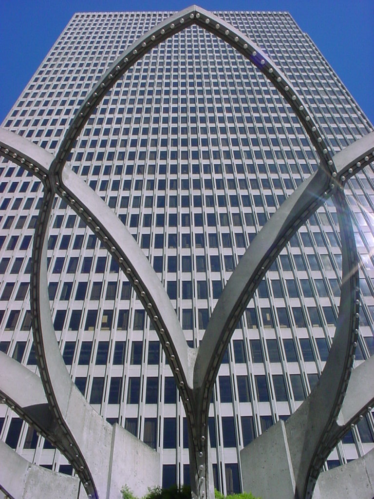 One of the concrete sculptures around the Embarcadero Center, with one of the four 1970s office towers behind. The Embarcadero Center is a vision in concrete, notable particularly for Armand Vaillancourt’s concrete fountain sculpture “Quebec Libre!”