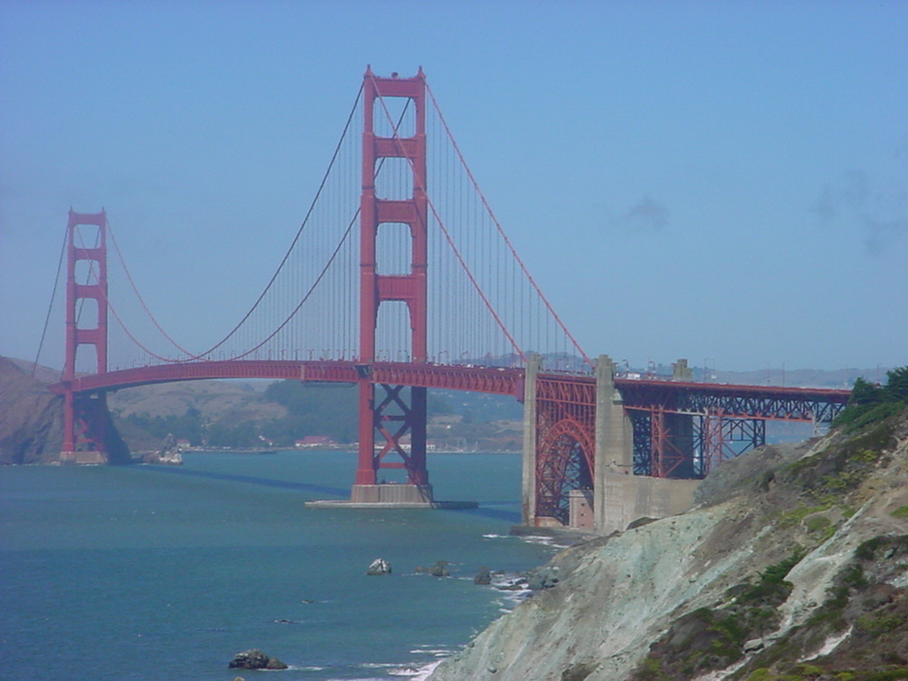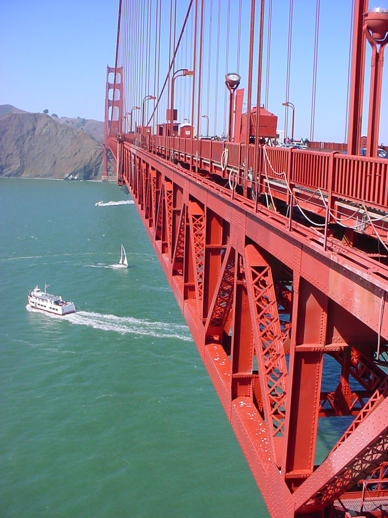 Crossing the Golden Gate Bridge. Although not much longer than the Forth Bridge in Edinburgh, the design was conceptually challenging due to the fast currents, depth of water and high winds. The bridge has been featured in many movies, in particular “James Bond: A View To A Kill” with a spectacular fight scene on one of the cables.