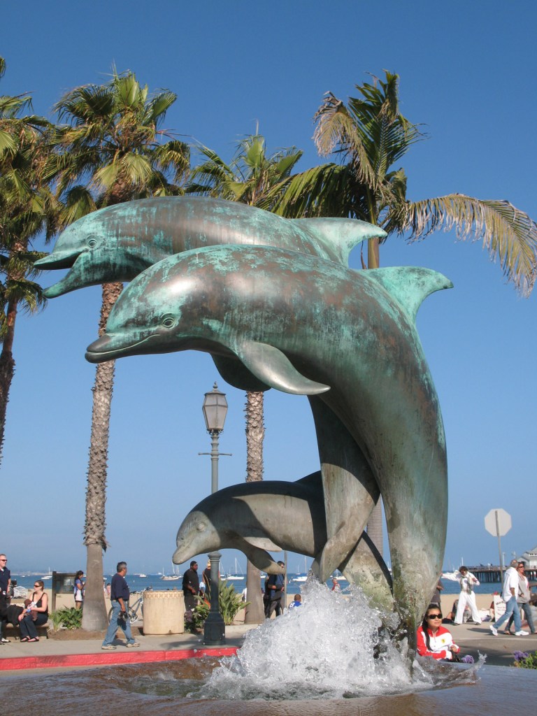 Dolphin fountain down by the base of Stearns Wharf, the pier at Santa Barbara beach.