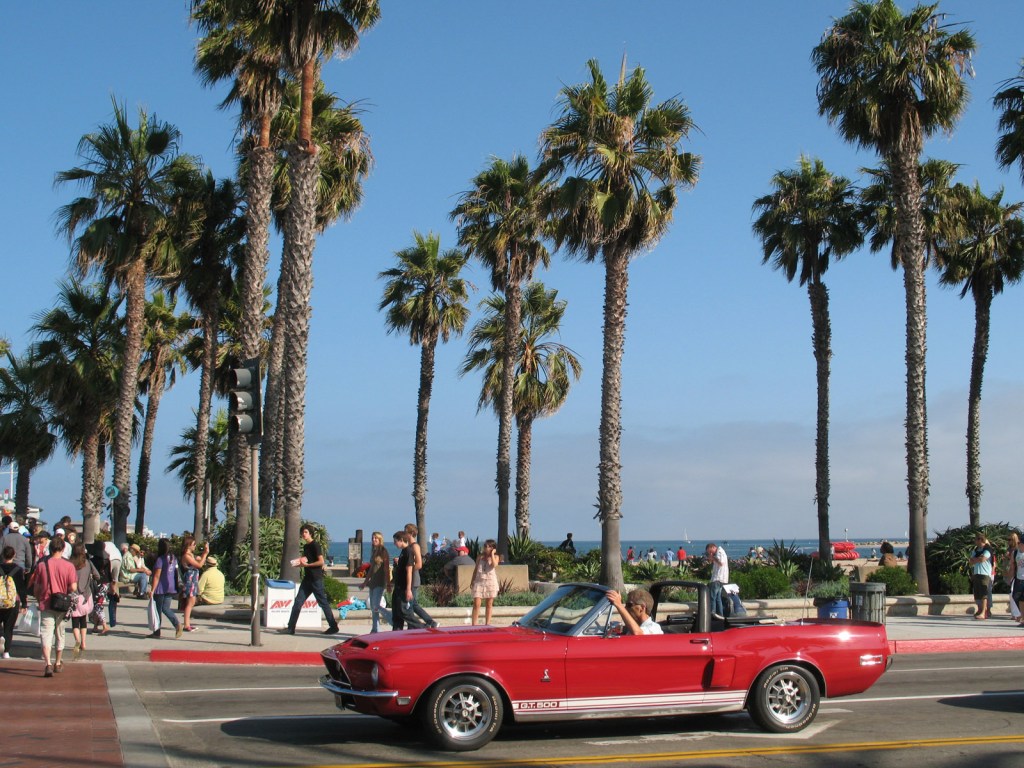 Santa Barbara beach, with the palm tree lined Cabrillo Boulevard, and the Santa Ynez Mountains not far away in the distance.