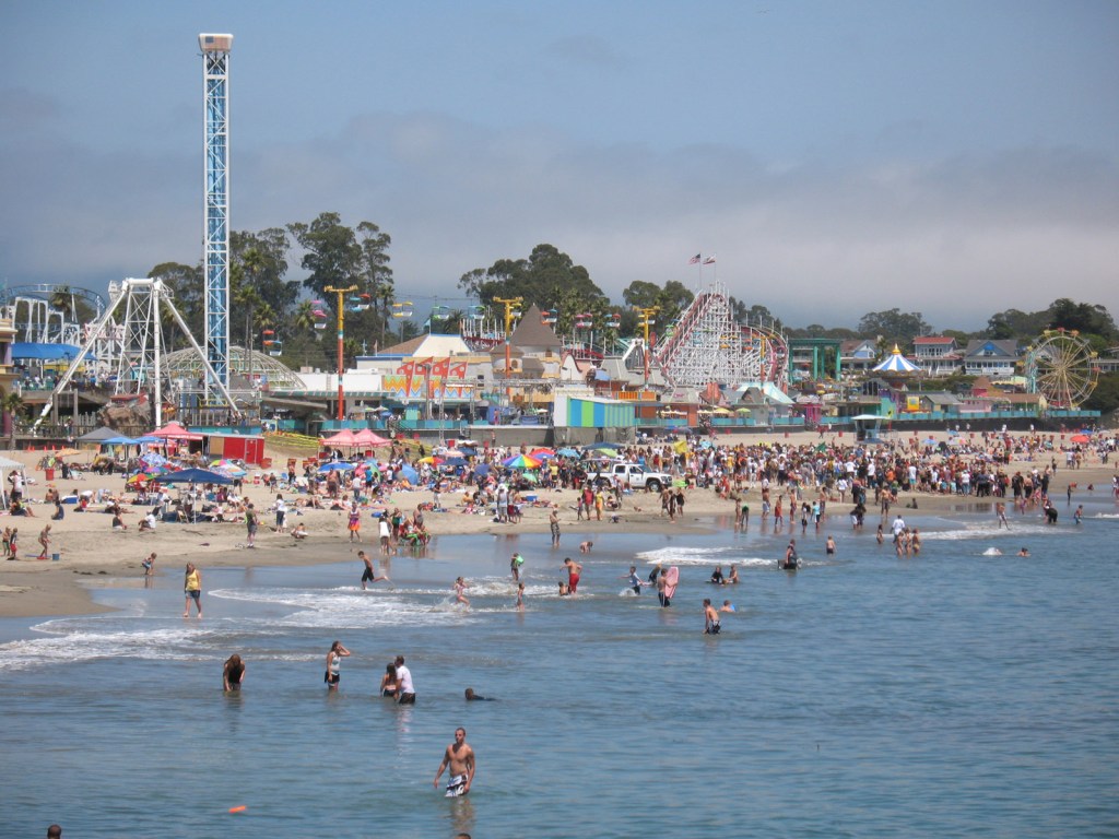 Sand spit and sunbathers at Santa Cruz beach. The Pacific summer fog loiters in the background.
