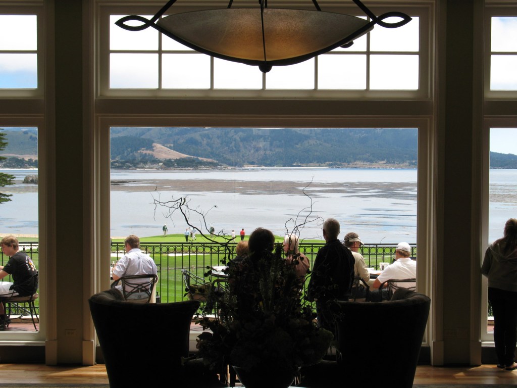 Inside The Lodge at Pebble Beach, there are the same great views across the Pacific, by roaring log fires (even in summer!)