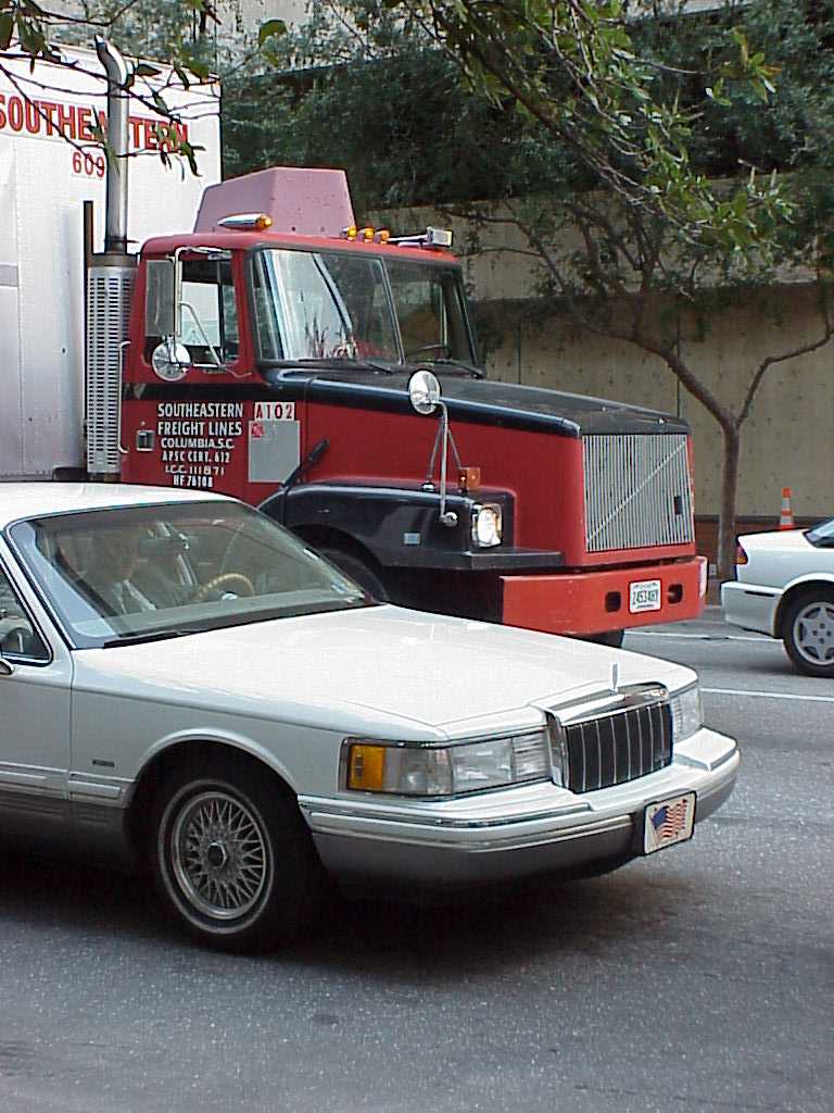A shot of some very American vehicles: an 18-wheeler and a Lincoln with the Stars and Stripes instead of a license plate. Florida state law doesn’t require a front license plate to be displayed, so there are some interesting custom choices on show.