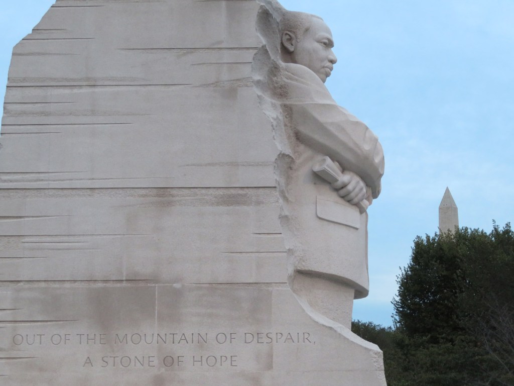 Martin Luther King Jr. is memorialised in light pink granite, not far from the Washington Monument. The memorial represents him emerging from the stone of hope, itself separate from a larger granite carved mountain of despair behind. It was dedicated in 2011.