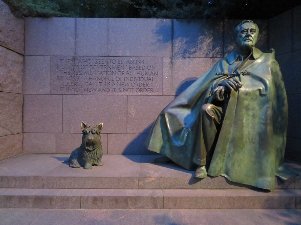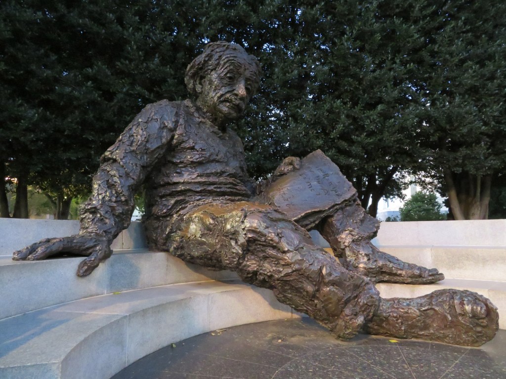 As we walked around the Tidal Basin we next encountered the Franklin Delano Roosevelt Memorial, commemorating the President who led the country through the twin perils of the Great Depression and the Second World War. He was the last President to sit for three terms, from 1933-1945, and is memorialised in bronze with his dog Fala.