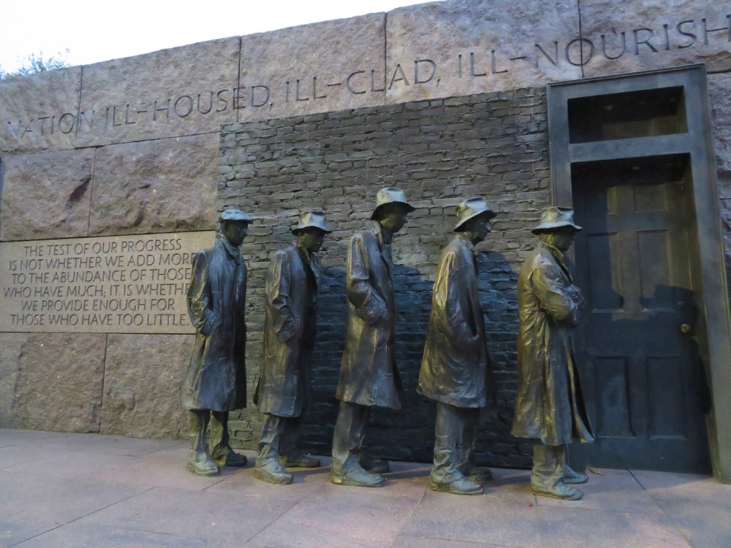 It is hard to overstate the impact that the Great Depression had on the United States, represented at the FDR Memorial by five impoverished figures waiting in a bread line. There is much wisdom to be read in the inscriptions throughout the memorial.