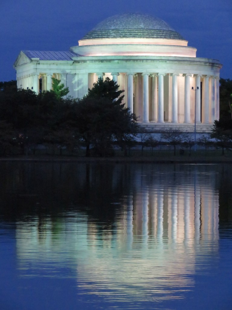 The sun had set by the time we approached the Jefferson Memorial, commemorating Thomas Jefferson, third president and author of the Declaration of Independence from the British. Its design was inspired by the Pantheon in Rome, even down to the rings around the roof dome.