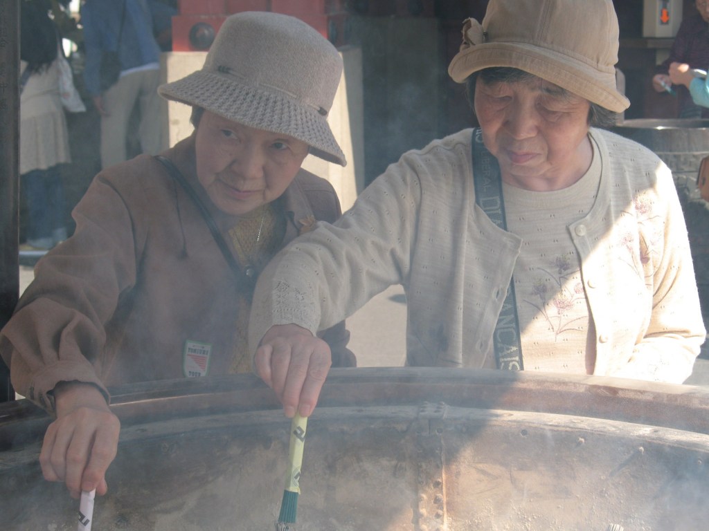 Old women burn incense in the Senso-ji temple in Asakusa. Also nearby was the headquarters of Asahi beer, with a large gold “thing” (a tadpole?) on the roof.