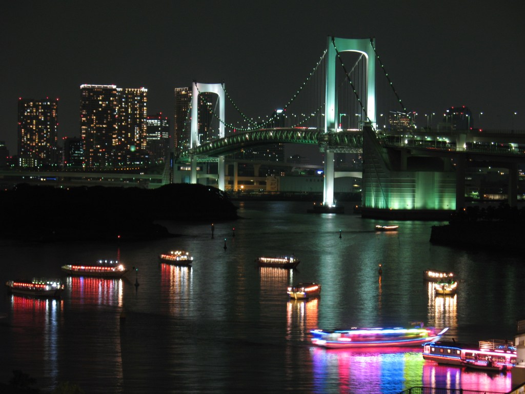 The Rainbow Bridge crosses part of Tokyo Bay to the reclaimed island of Odaiba, and carries two levels of traffic plus light railway lines. The bridge is so-called because of the way it is usually lit, but on that night it was the boats which were stealing the show.