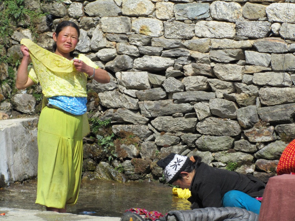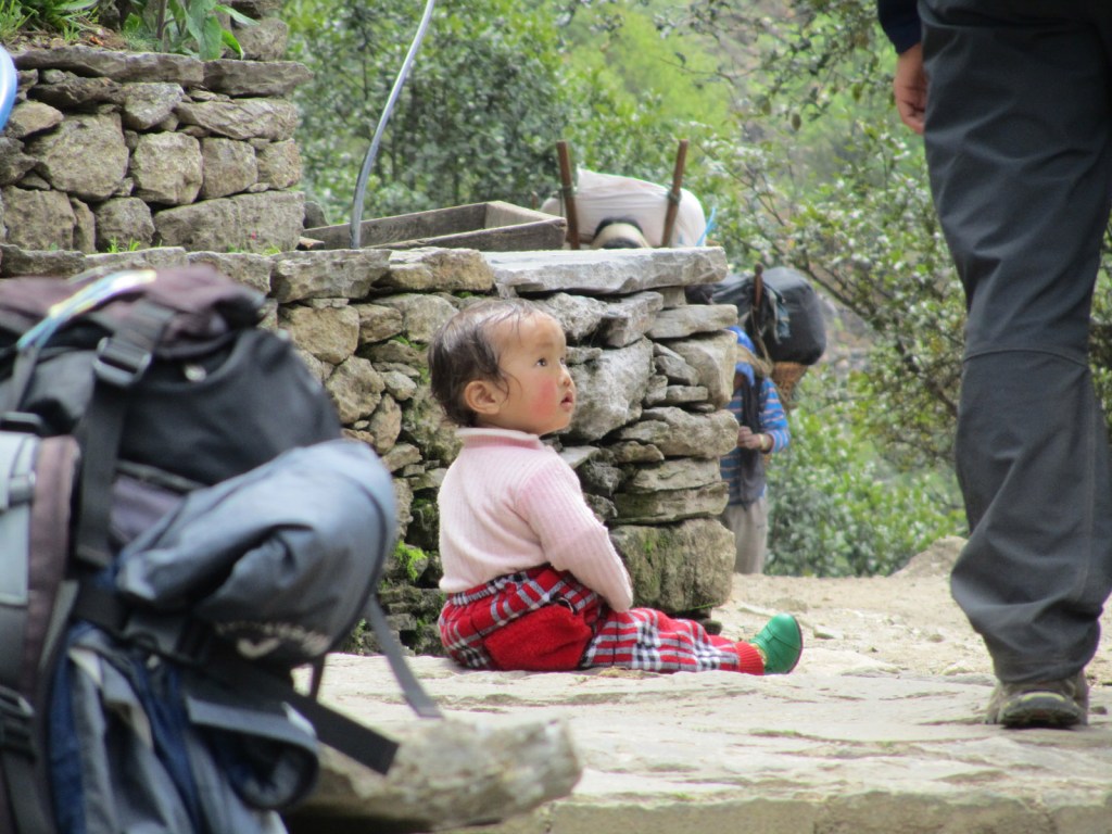 A small child stares with wonder or possibly bemusement, at the people setting off for their voluntary physical punishment. We met people on their way down from summitting Everest, there faces were ashen but cheerful.