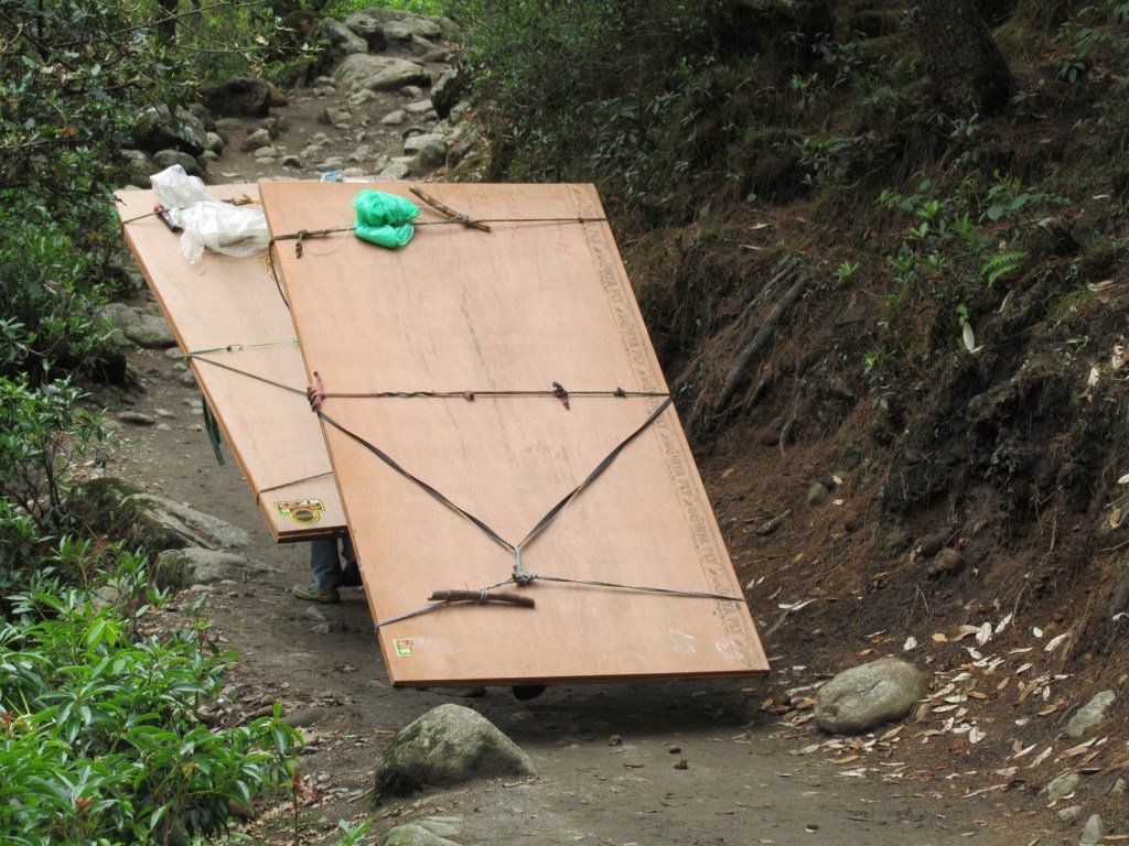 Where four-legged power is not available, gear is carried by hand in lots of up to one hundred kilos. Here these two chaps remind me of leaf cutter ants, carrying stacks of flat boards that almost completely obscure them.