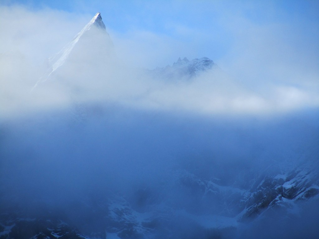 The jagged peaks that surround Lukla poke through the morning cloud on the day of our departure.