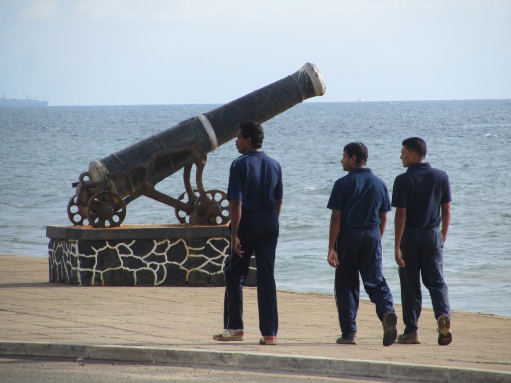 Down on the Indian Ocean coast, locals take a stroll past the historic defences. These cannons were set up by the Dutch, to repel a potential attack by the Portuguese.