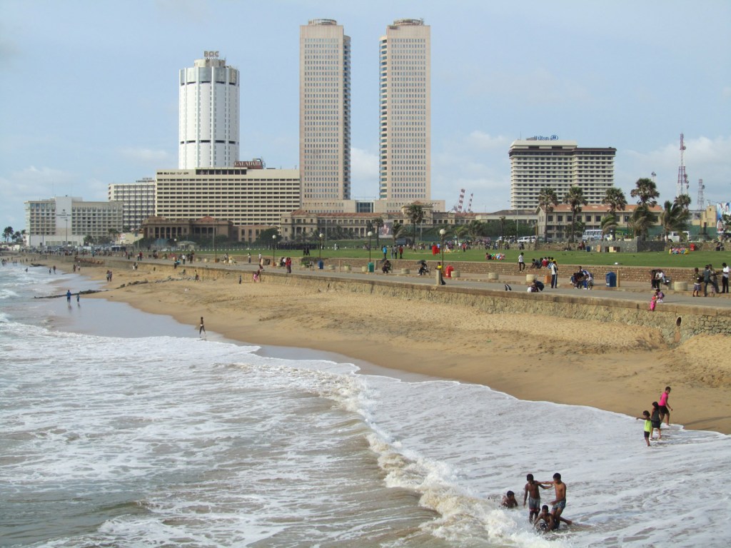 A view back up Galle Face Green with the twin World Trade Centre towers and the Old Parliament Building on the left. At the very far left is the Kingsbury Hotel, one of the targets of the 2019 Easter bombings.
