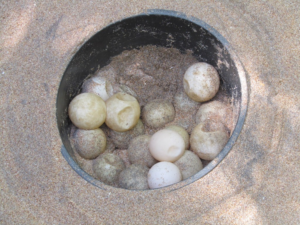 A small selection of turtle eggs at the hatchery. The eggs look slightly dented as there’s a little room for thermal expansion.