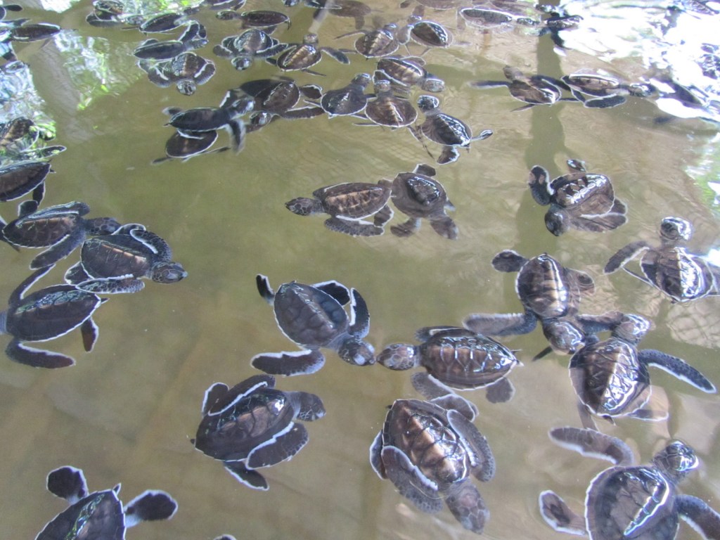 Baby turtles barely a few days old. Ninety-nine percent hatched are male, and they are released to the sea when not much larger than this. The females are much more valuable, so are separated and grown in captivity for several years before release.